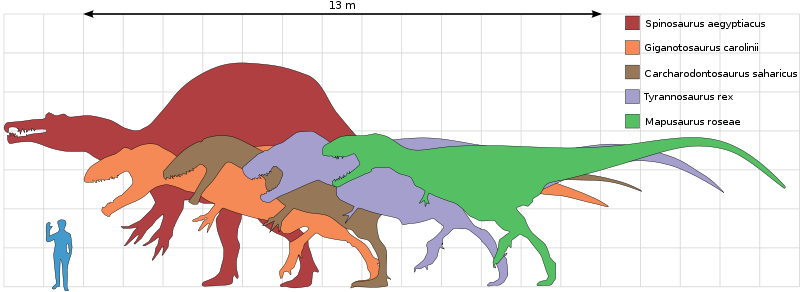 Size comparison of selected giant theropod dinosaurs, with Tyrannosaurus in purple.